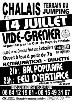 Le Comité des Fêtes de Chalais organise son traditionnel vide grenier du 14 juillet 2022 sur le terrain du jumping. La soirée s'annonce festive, avec un bal populaire à 21 h et un feu d'artifice à 23 h ! Informations et inscriptions au 06 64 12 15 61 ou 06 15 49 31 67